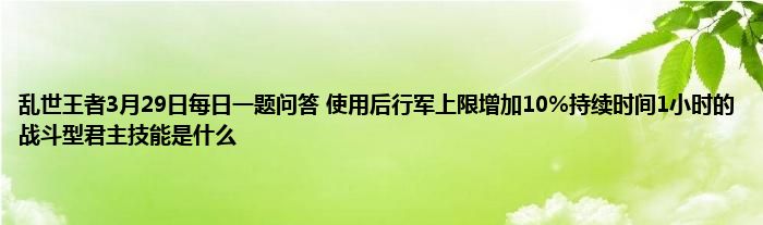 以上就是乱世王者3月29日每日一题问答 使用后行军上限增加10%持续时间1小时的战斗型君主技能是什么的推荐,相信通过乱世王者3月29日每日一题问答 使用后行军上限增加10%持续时间1小时的战斗型君主技能是什么这篇文章能帮到你,也欢迎对游戏很感兴趣小伙伴们一起来探讨。