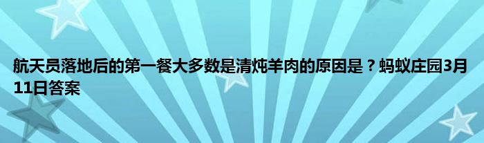 航天员落地后的第一餐是清炖羊肉的原因是?蚂蚁庄园3月11日答案。蚂蚁庄园3月12日的问题已经出来了,问题包括航天员落地后的第一餐是清炖羊肉的原因是什么,答对可以获得奖励,那么答案是什么呢,下面就跟着小编一起看看吧。